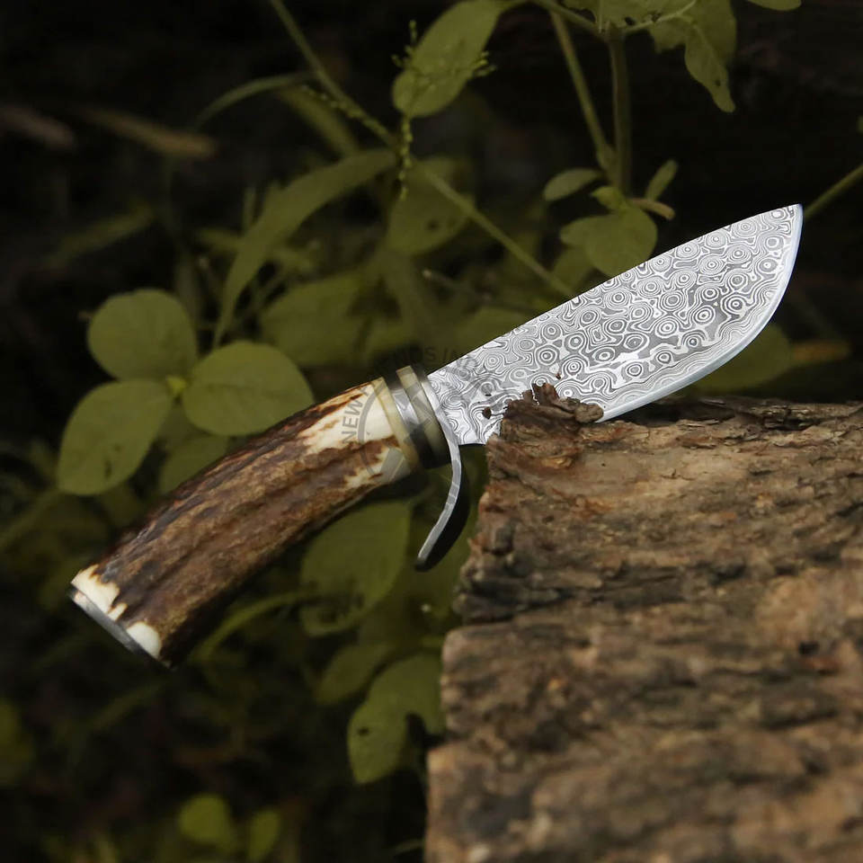มีดล่าสัตว์โบวี่เหล็กดามัสกัส 9.5 นิ้ว เหล็กกล้าคาร์บอนสูง 1095 ผสมโลหะผสม 15N20 ใบมีดคงที่ ใช้ได้ทั้งมือซ้ายและขวา ตีขึ้นรูปด้วยมือ ด้ามทำจากเขากวาง