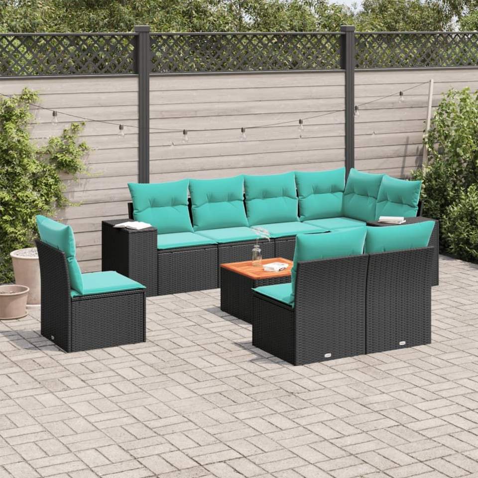 ชุดโซฟาลานบ้านหวายโพลีสีดำ 9 ชิ้นพร้อมชุดเบาะรองนั่งในสวน