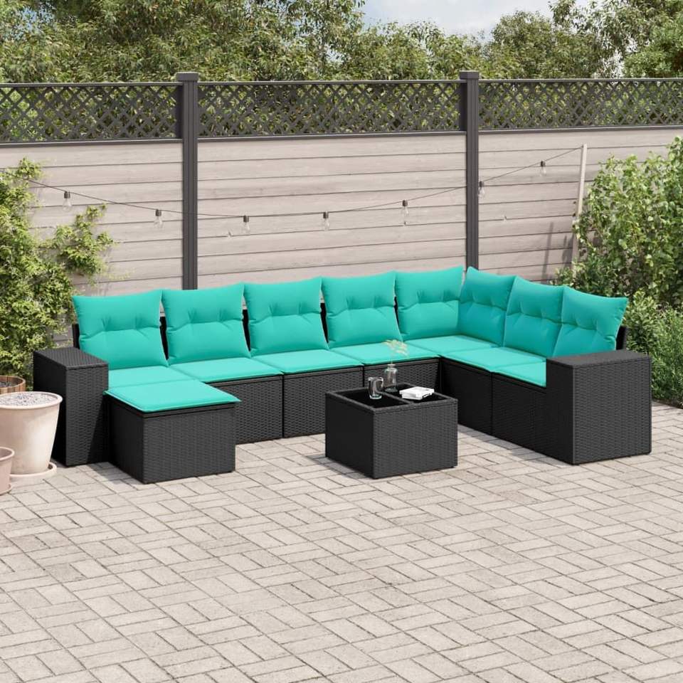 ชุดโซฟาลานบ้านหวายโพลีสีดำ 9 ชิ้นพร้อมชุดเบาะรองนั่งในสวน