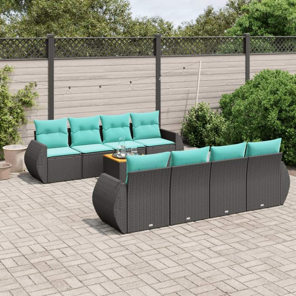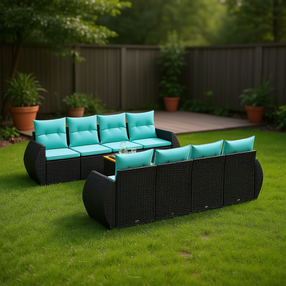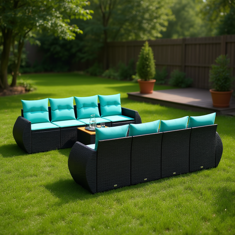 ชุดโซฟาหวายสังเคราะห์สีดำ 9 ชิ้น เฟอร์นิเจอร์สวนสำหรับนั่งเล่นกลางแจ้ง ดีไซน์ร่วมสมัย พร้อมเบาะรองนั่ง