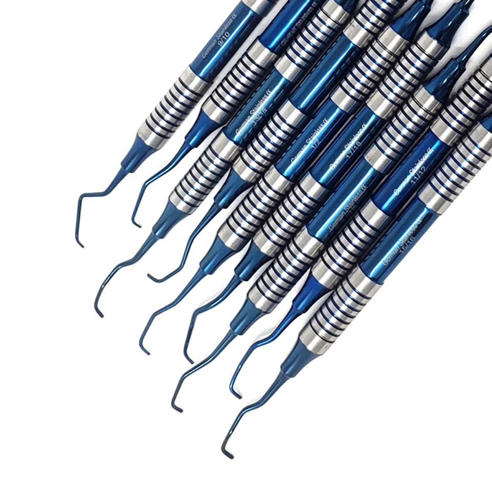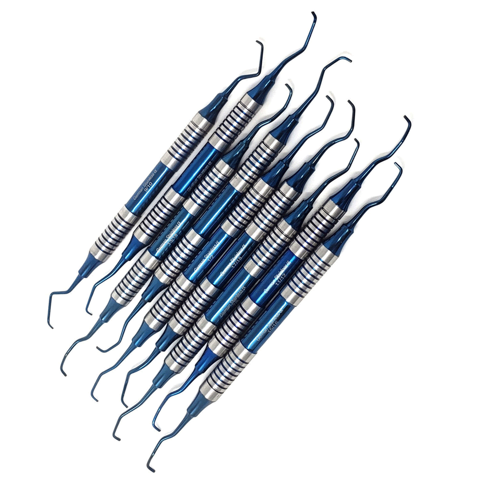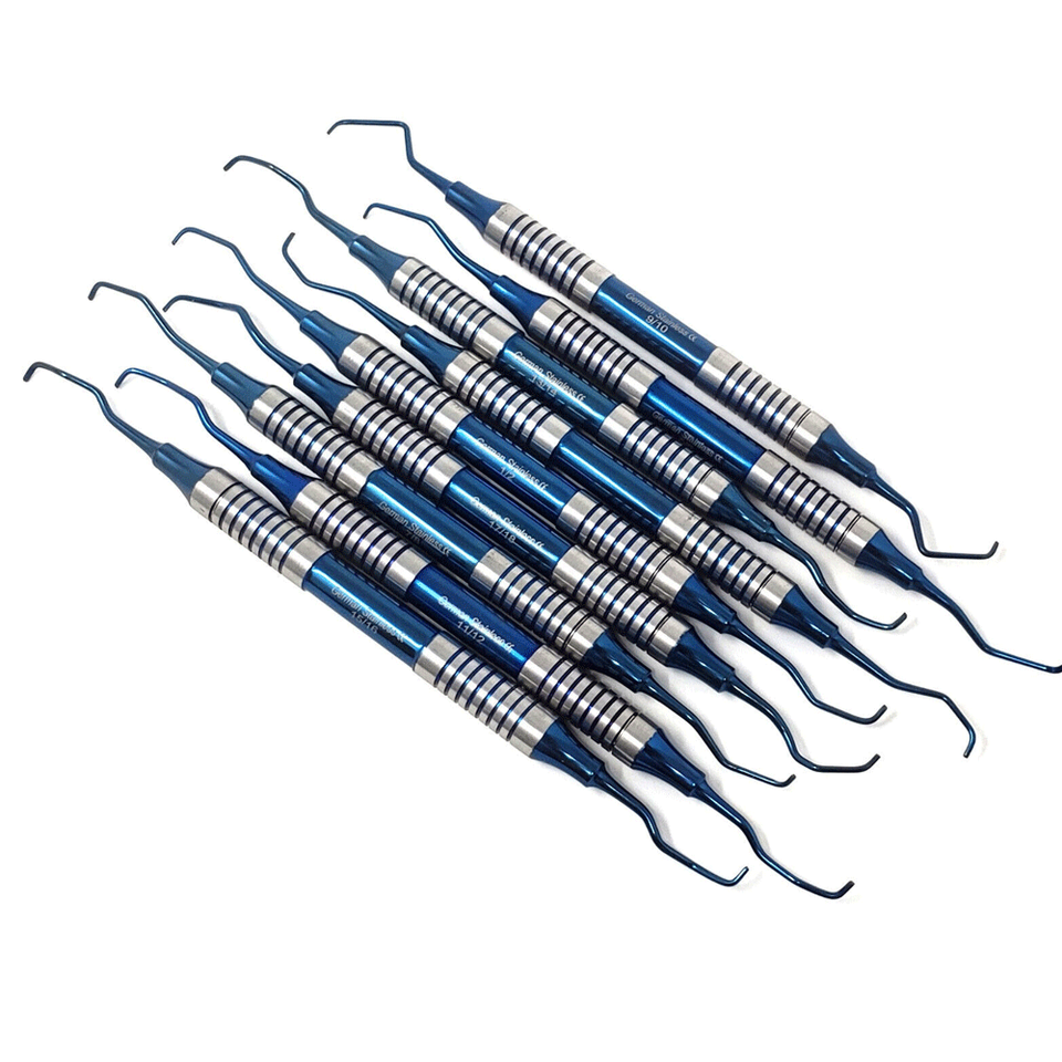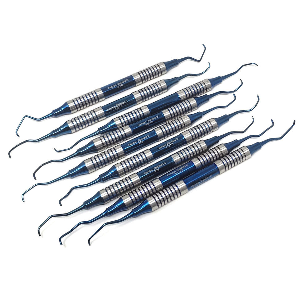 ชุดที่ขูดหินปูน9ชิ้นเครื่องมือปริทันต์ปลายสองด้านทำจากไทเทเนียมสีฟ้าด้ามจับกลวงมีใบรับรอง CE