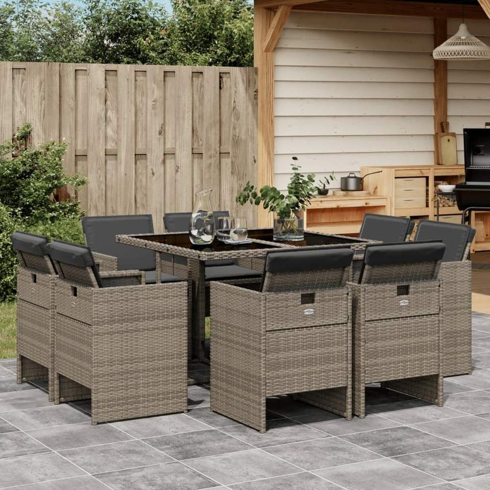 ชุดรับประทานอาหารหวายโพลีสีเทา9ชิ้นพร้อมหมอนอิงเฟอร์นิเจอร์กลางแจ้งที่ทนทาน