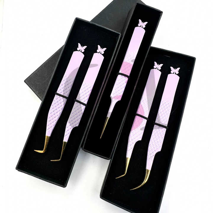 แหนบสำหรับต่อขนตาแบบโค้งรูปผีเสื้อแบบแยกผงเคลือบสีม่วง90และ45องศาอุปกรณ์เสริมความงามติดโลโก้แบบกำหนดเอง