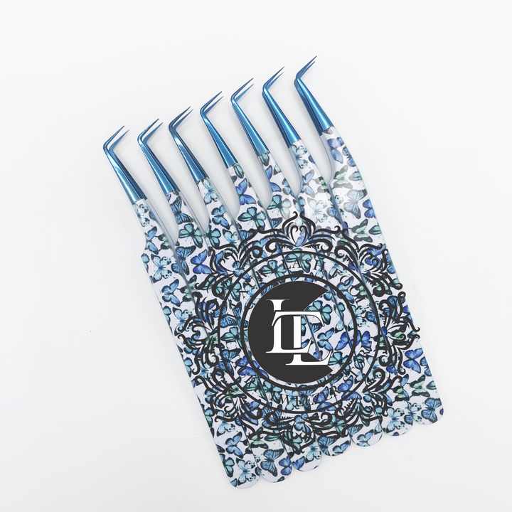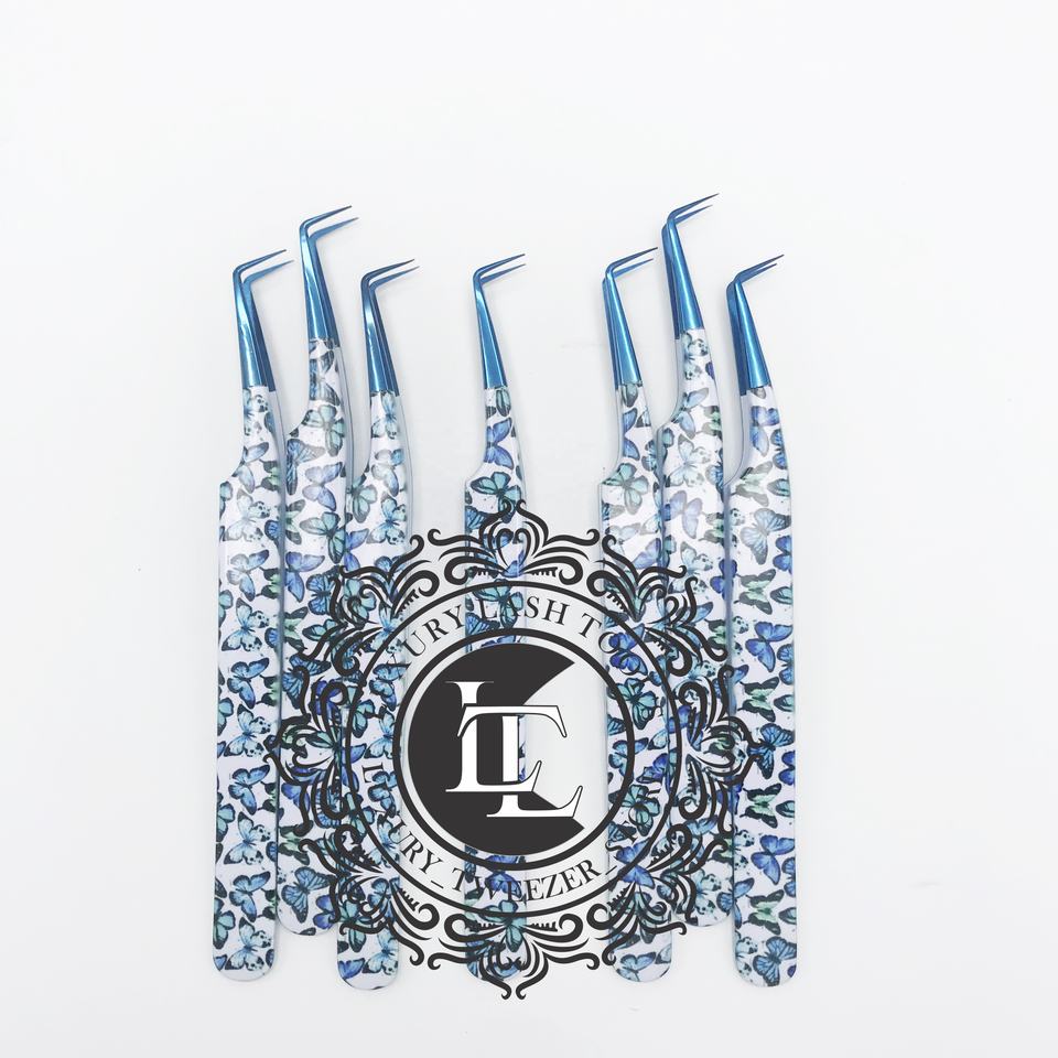 แหนบเคลือบกระดาษผีเสื้อจุดสีน้ำเงิน90องศา9มม. ทำด้วยมือสแตนเลสด้ามจับเรียบ