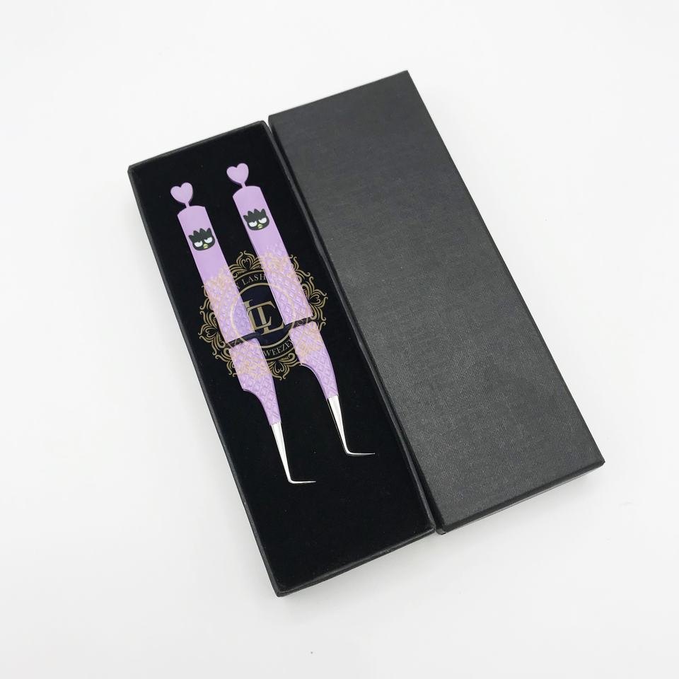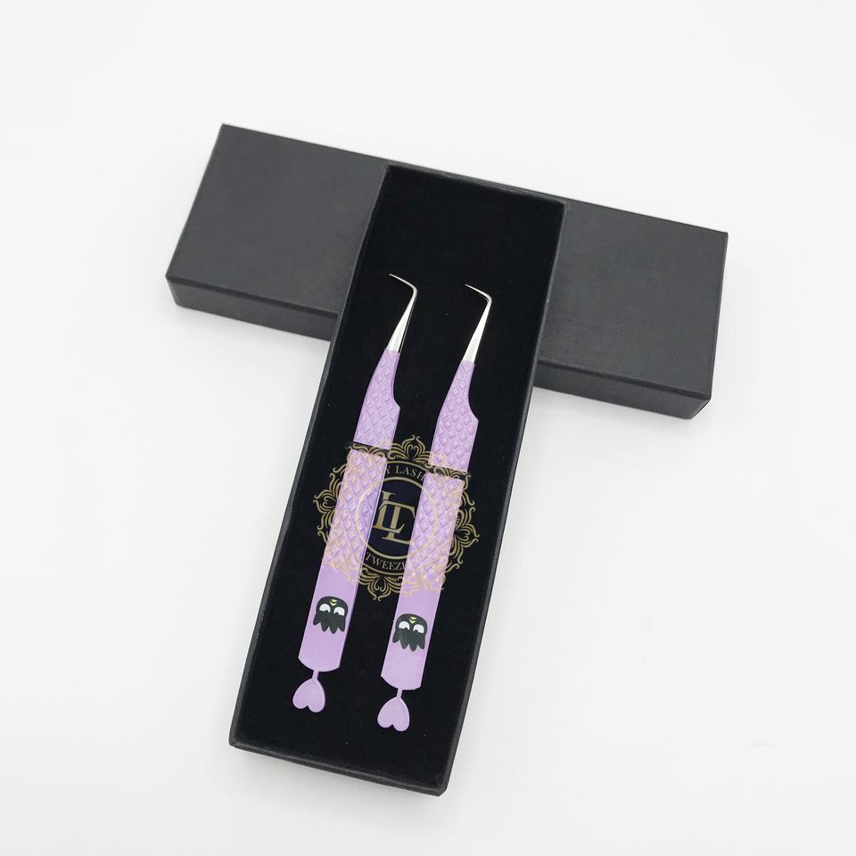 แหนบต่อขนตาหรูหรา 90 องศา เคลือบกระดาษสีม่วง ปลายสีเงินรูปหัวใจ ด้ามจับเพชรแบบยั่งยืน
