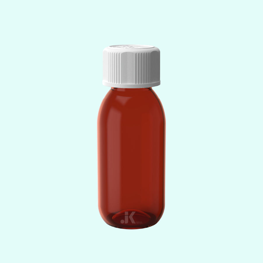 ขวดน้ำเชื่อม PET ขนาด 90 มล. พร้อมฝา CR สีอำพัน รุ่น JK Packaging Solutions ผลิตที่เมืองโฮจิมินห์ รับผลิตแบบ OEM/ODM รหัส M0761
