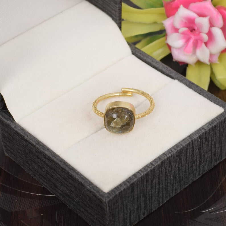 แหวนเงินสเตอร์ลิง92.5ปรับได้พร้อมอัญมณีลาบราดอไรต์แบบหลวม
