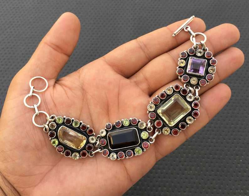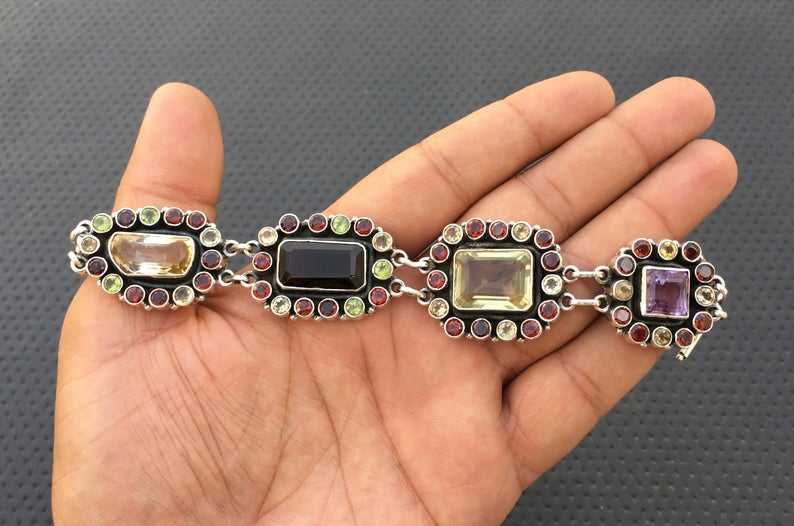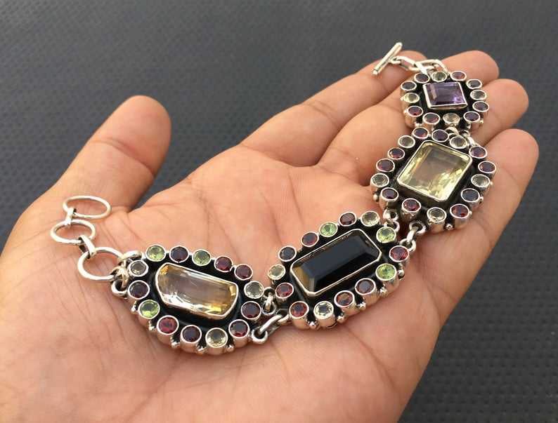 กำไลข้อมือชุบทองสเตอร์ลิง92.5อัญมณีหลายเหลี่ยมเพชรพลอยแท้แท้รูปทรงสี่เหลี่ยมผืนผ้าขนาด8 "ของขวัญแฮนด์เมดยาว