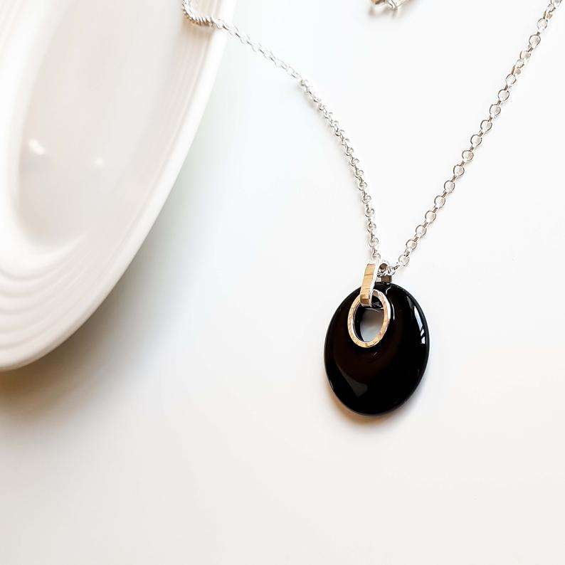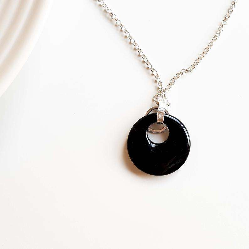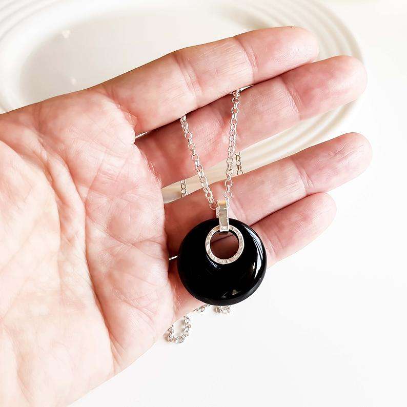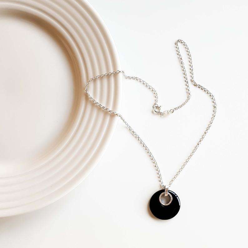 สร้อยโดนัทโอนิกซ์สีดำธรรมชาติสีเงิน92.5สำหรับผู้หญิงโซ่เชื่อมยาว18นิ้วสำหรับเป็นของขวัญอัญมณีราศีการหมั้น