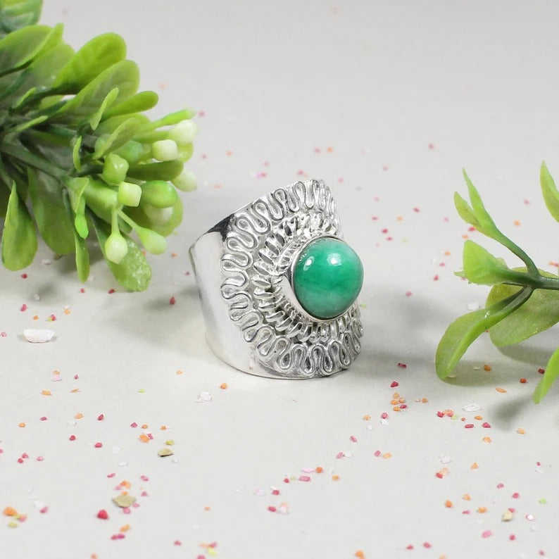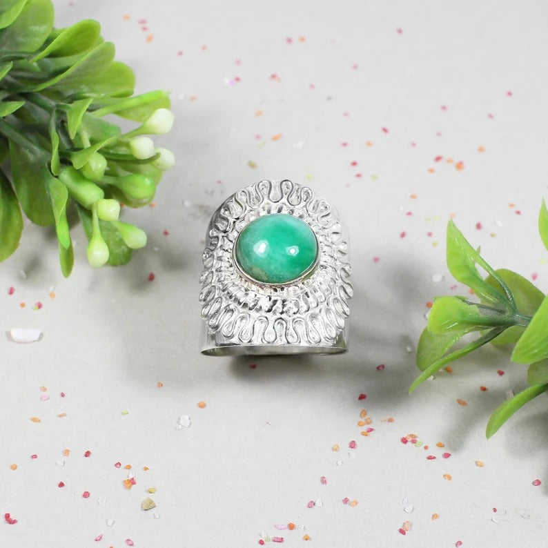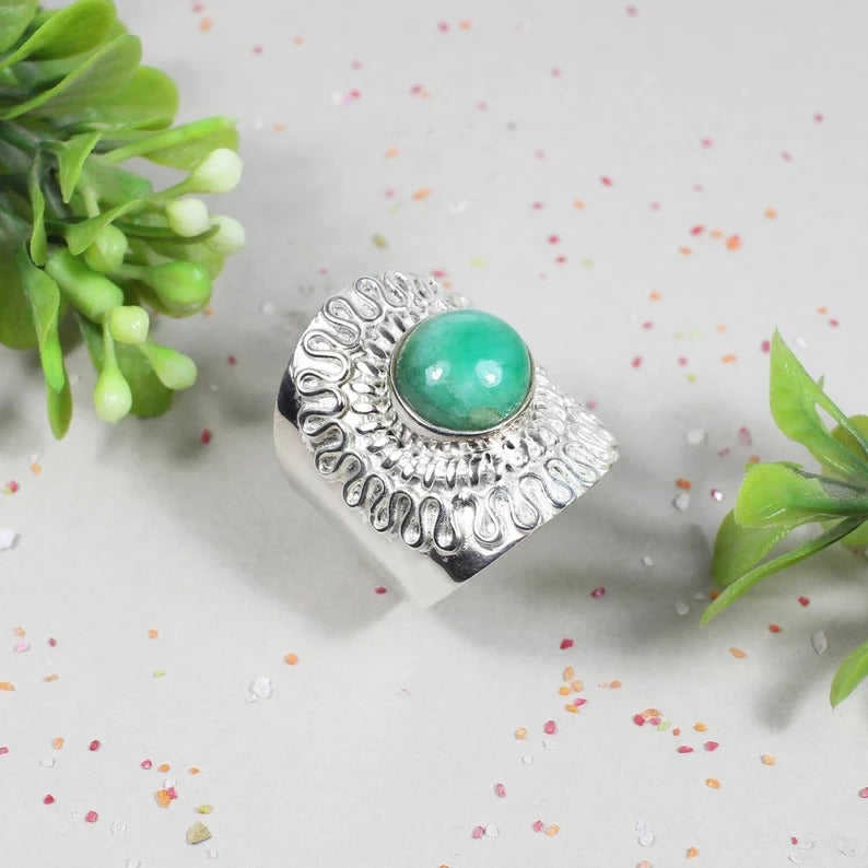 แหวนเงินสเตอริ92.5ที่มีรูปแบบทางเรขาคณิตอัญมณี chrysoprase ธรรมชาติและตัดรูปไข่โรเดียมชุบเครื่องประดับที่ดี