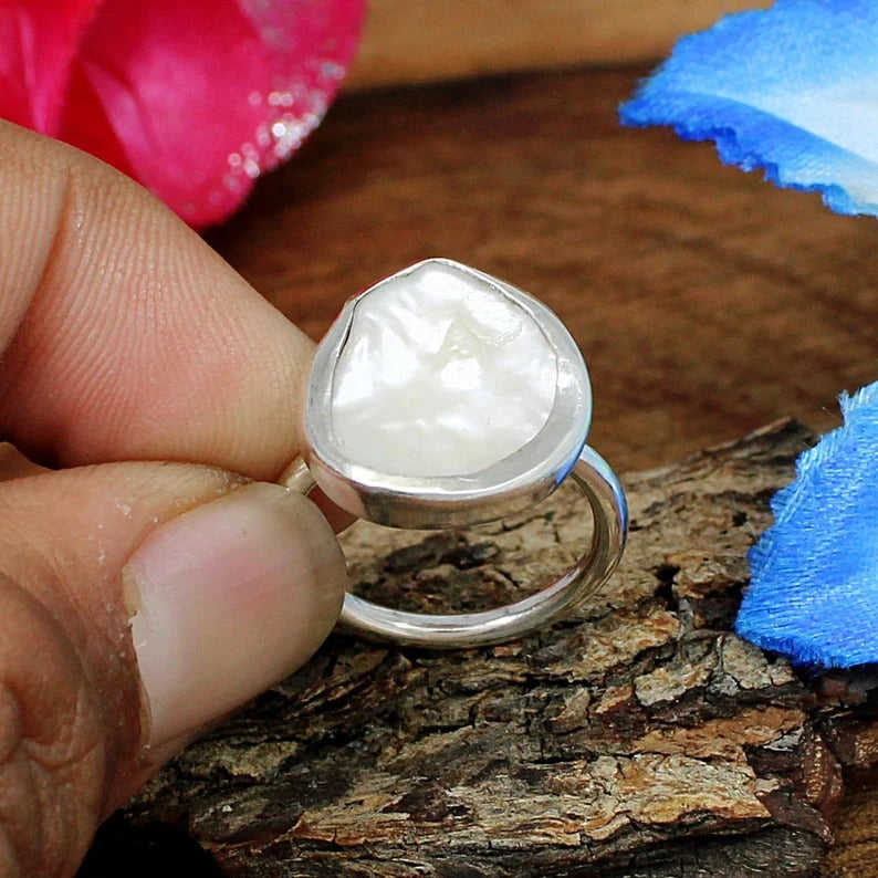 แหวนเงินแท้ 92.5 ประดับด้วยพลอยมุกบาโรก 17x15 มม. รูปทรงแฟนซี น้ำหนัก 4 กรัม