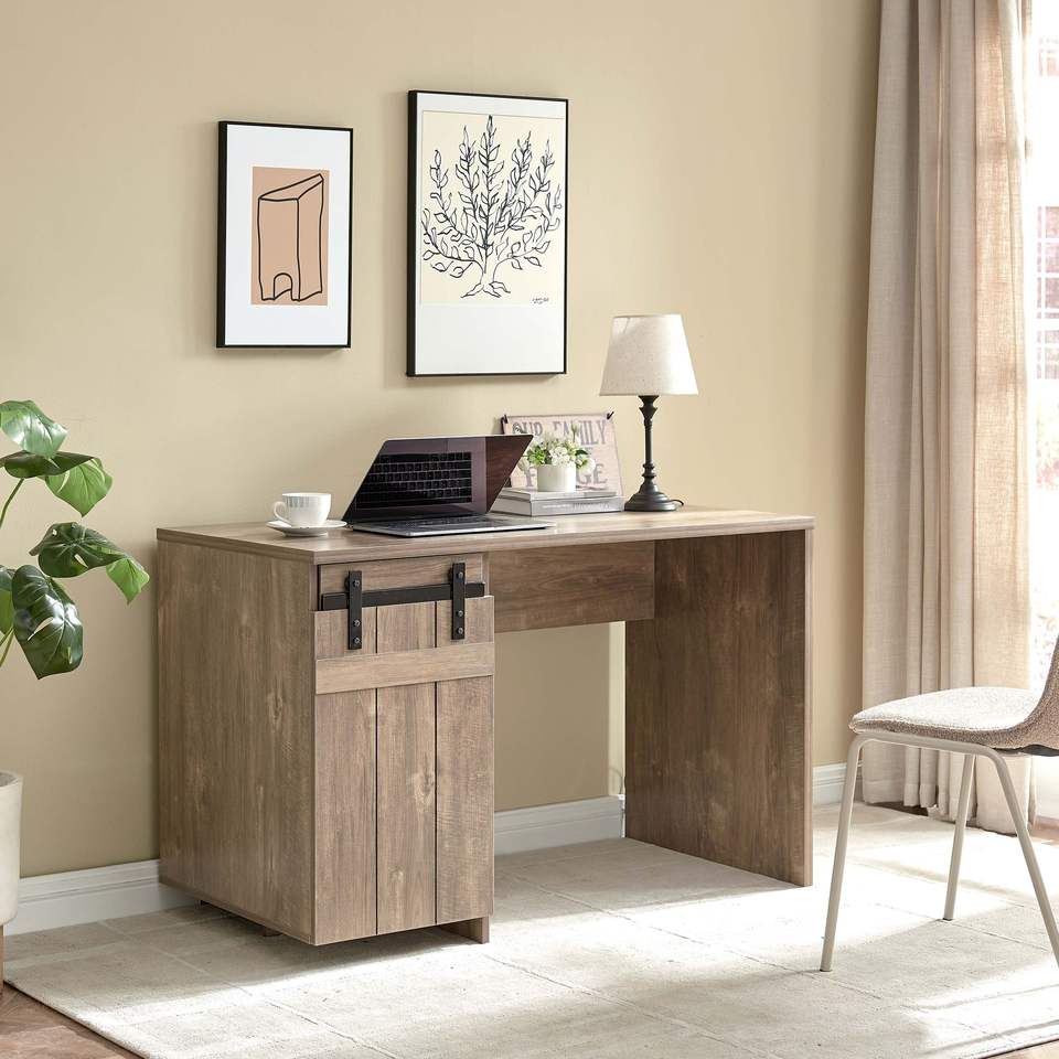 โต๊ะทำงานโฮมออฟฟิศ รุ่น 92205 สีเฮเซลนัท พร้อมตู้เก็บของหนึ่งตู้ ชั้นวางของสามชั้น ประตูบานเลื่อนแบบยุโรป บานประตูโลหะ พร้อมแผงบังตา โต๊ะคอมพิวเตอร์