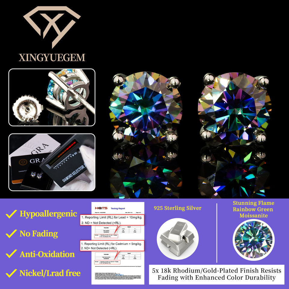 ต่างหูเงินแท้ 925 ประดับมอสซาไนต์ทรงบริลเลียนท์คัท VVS ป้องกันการแพ้ เหมาะสำหรับเป็นของขวัญ งานปาร์ตี้ งานแต่งงาน สีรุ้งเขียว ขนาด 5 มม./6.5 มม. ชุบทอง สำหรับทุกเพศ