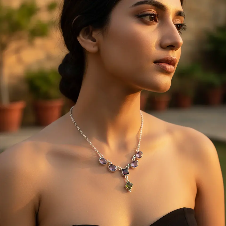 สร้อยคอเงินแท้ 925 ประดับอเมทิสต์และเพอริดอต สำหรับผู้หญิง เครื่องประดับคริสตัลพลอยสุดหรู