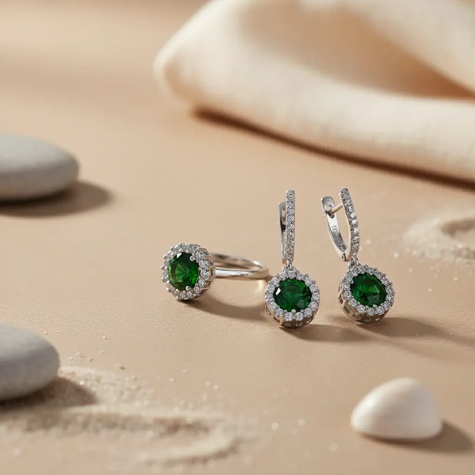 ชุดแหวนและต่างหูเงินแท้ 925 ประดับมรกตและเพชรซิคอน ชุบทองคำขาว สำหรับงานปาร์ตี้หรืองานแต่งงาน ของขวัญเครื่องประดับชุบทองสำหรับผู้หญิง