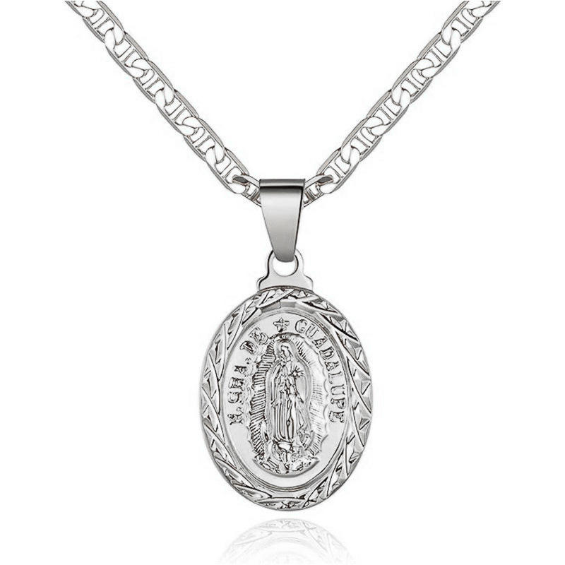 จี้พระแม่กัวดาลูปเงินแท้ 925 พร้อมสร้อยคอฟิกาโร่ชุบโรเดียม เครื่องประดับทางศาสนาคาทอลิกสำหรับทุกเพศ