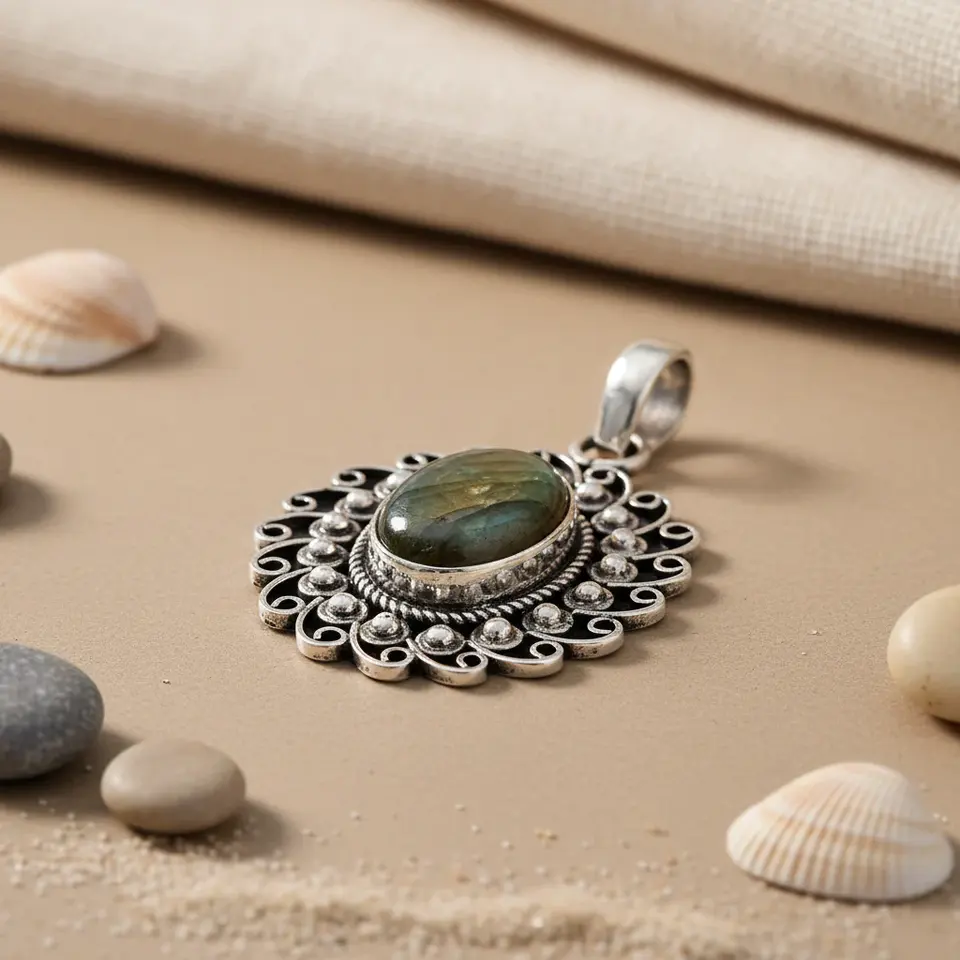 จี้เงินแท้ 925 ประดับลาบราโดไรต์สำหรับผู้หญิง เครื่องประดับพลอยโรสโกลด์ พร้อมจี้คริสตัลเพชรและไข่มุกเป็นวัสดุหลัก