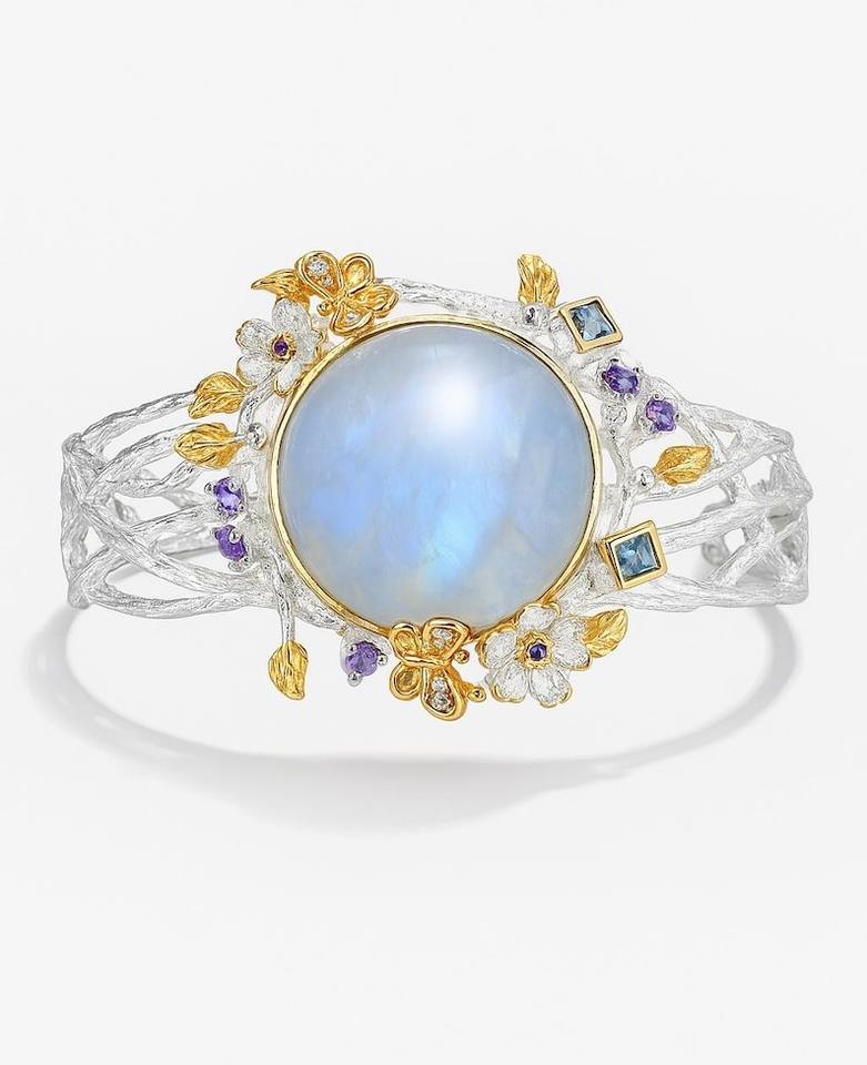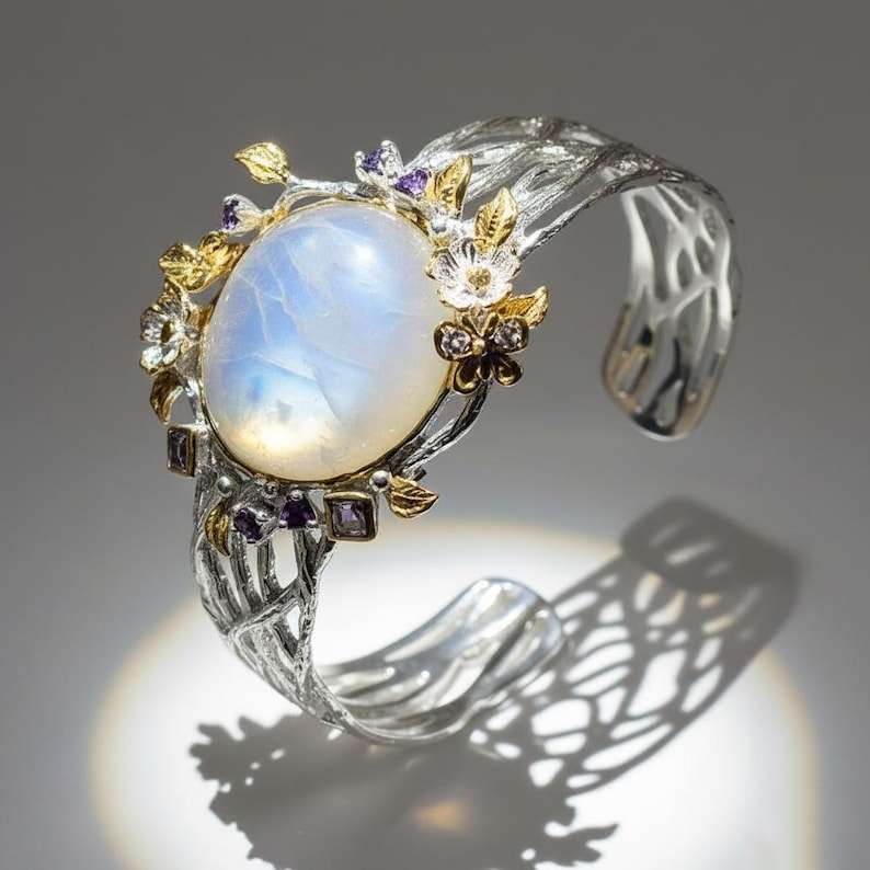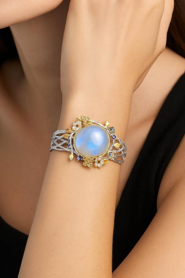 กำไลข้อมือเงินแท้ 925 ประดับมูนสโตนรูปดอกไม้ ดีไซน์หรูหรา สวยงามเหนือกาลเวลา ระดับพรีเมียม