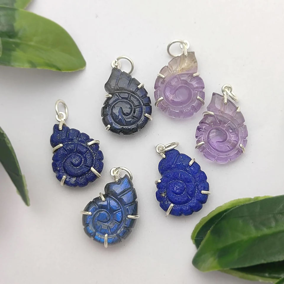 จี้สร้อยคอพลอย925สลักเปลือกหอยเปลือกหอยหอยโข่ง | เครื่องประดับชุดง่ามหินธรรมชาติทำด้วยมือ