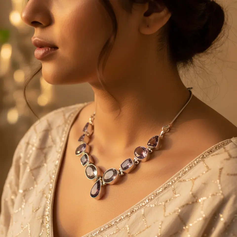 สร้อยคอเงินแท้ 925 ประดับพลอยอเมทิสต์ ชุบโรเดียม พร้อมหยกและเทอร์ควอยซ์ สไตล์คลาสสิกทันสมัย เหมาะสำหรับเป็นของขวัญสำหรับผู้หญิงในโอกาสหมั้น