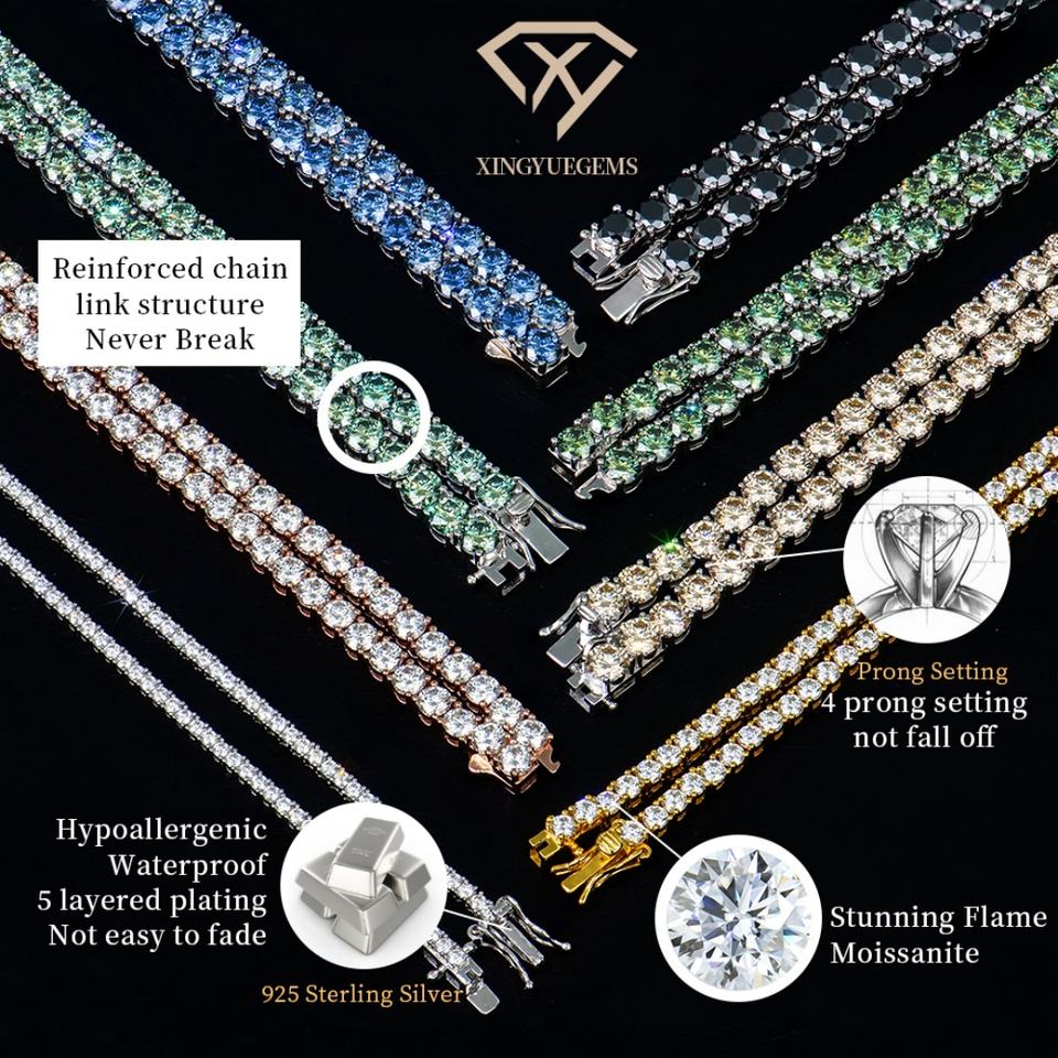 สร้อยคอเงินแท้ 925 ชุบโรเดียม ประดับเพชรโมอิสซาไนต์ทรงกลมเจียระไนแบบบริลเลียนท์ สีดำ แชมเปญ น้ำเงินรอยัล สีเดิม แบบเทนนิส