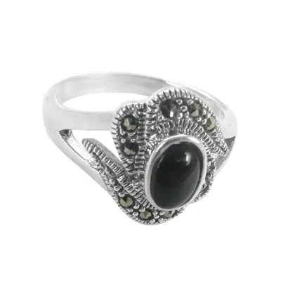แหวนเงินแท้ 925 ประดับออนิกซ์และมาร์คาไซต์สำหรับผู้หญิง ชุบโรเดียม พร้อมมรกตและเพชรทรงลูกแพร์ วัสดุแพลตตินัม ของขวัญเครื่องประดับ