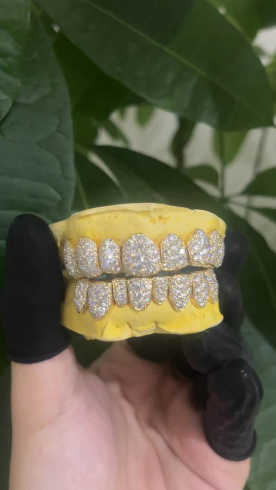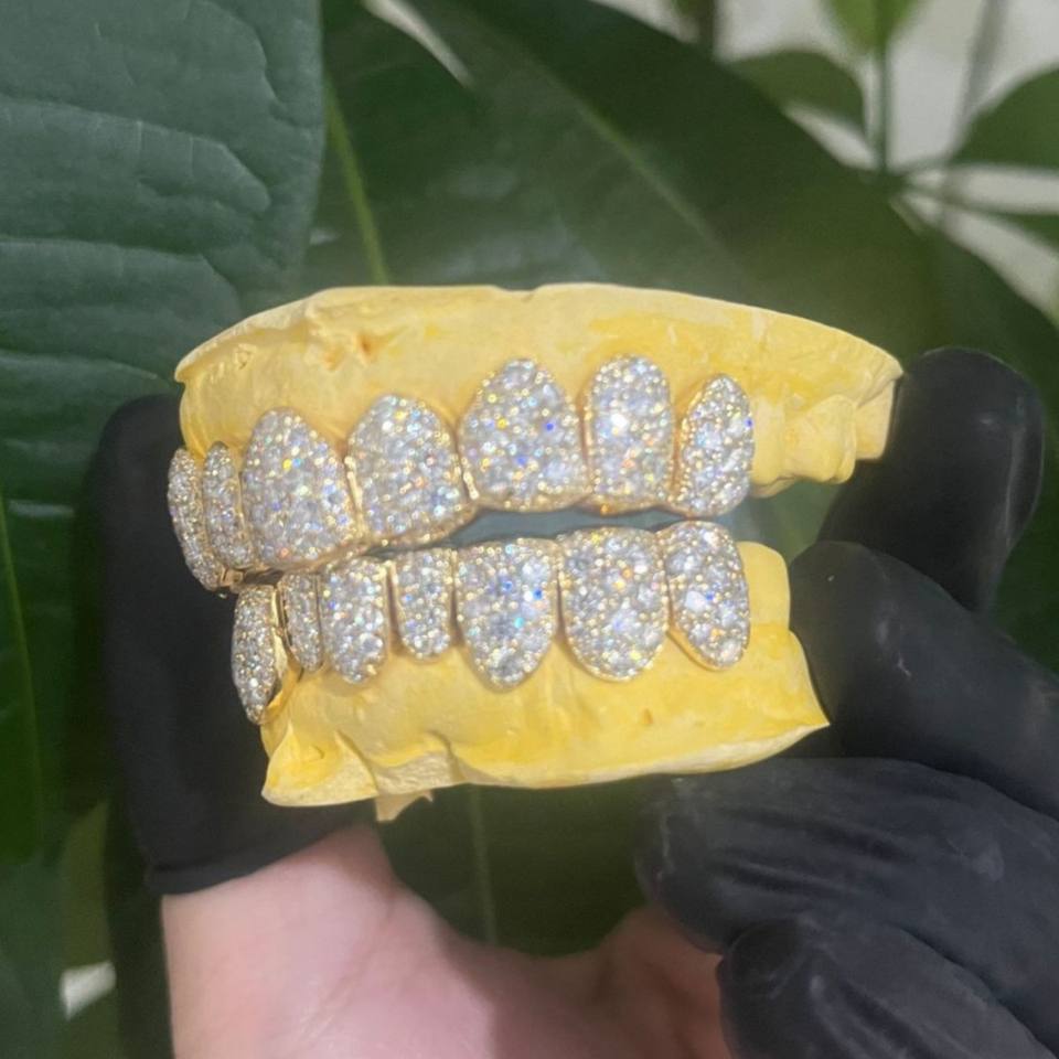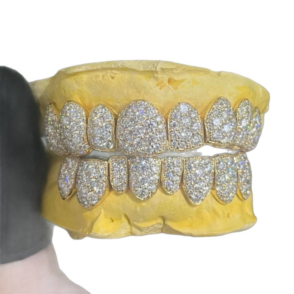 เครื่องประดับเงินแท้ 925 ชุบทอง 18K ฝังโมอิสซาไนต์แบบโมเสก ครอบฟันบนและล่าง สำหรับผู้ชายและผู้หญิง สไตล์ฮิปฮอปแร็ป ชุดแปดชิ้น