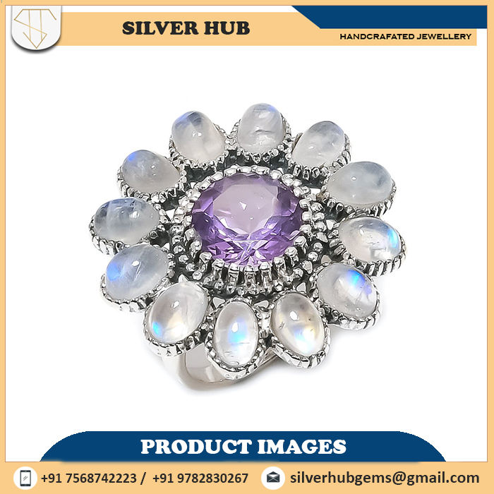 แหวนพลอยอเมทิสต์และพลอยมูนสโตนสีเงินสเตอร์ลิงสำหรับ925แหวนชั้นดีเครื่องประดับ OEM พลอยวันเกิดขายส่งของขวัญวันวาเลนไทน์