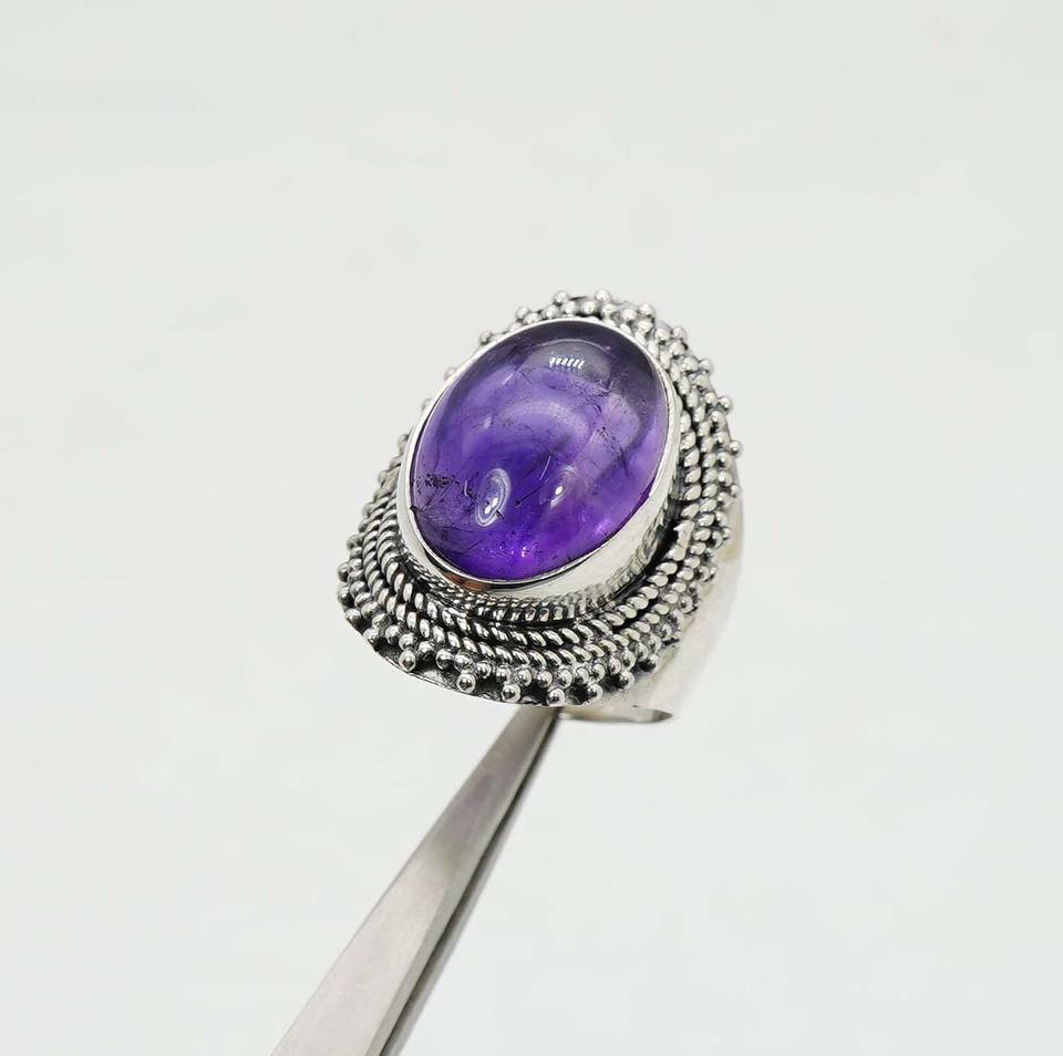 แหวนรูปวงรีสำหรับเดือนขนนกสีเงินสเตอร์ลิงสำหรับ925หินอเมทิสต์สีม่วงพร้อมฐานหนามเตย