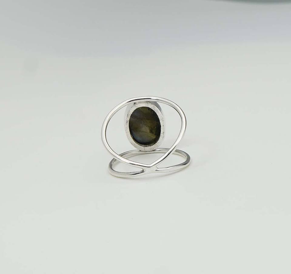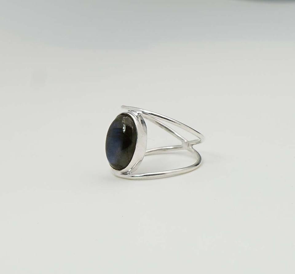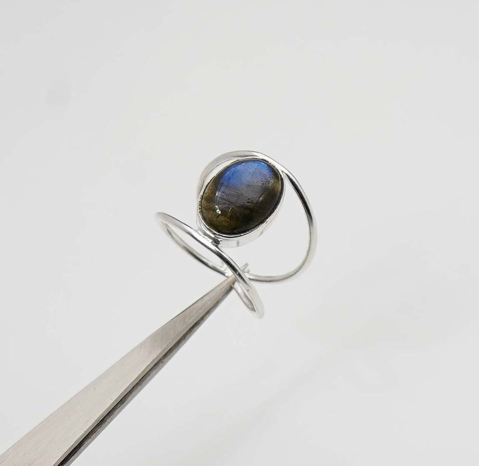925เงินแท้แท้เดือนโนโวมเบอร์หินลาบราดอไรต์พร้อมฐานหนามเตยพลอยรูปวงรีวงแหวนคู่