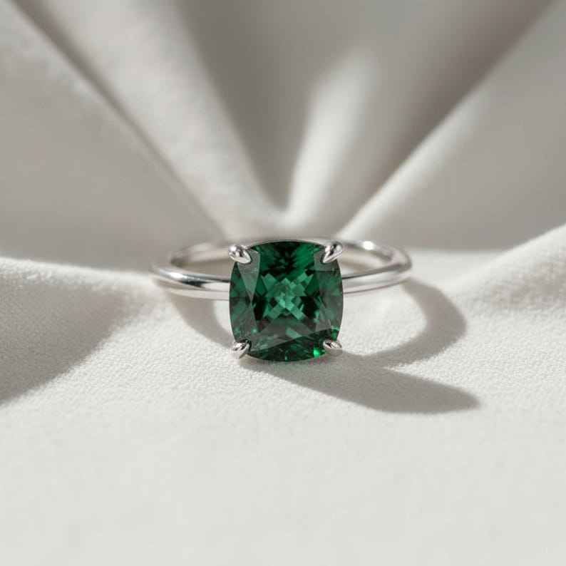 แหวนเงินแท้ 925 ประดับพลอยมรกตทรงคุชชั่นขนาด 10 มม. แบบฝังหนามเตย สำหรับงานหมั้น สไตล์โบฮีเมียน คริสเตียน โซลิแทร์ แหวนแทนใจ วันวาเลนไทน์