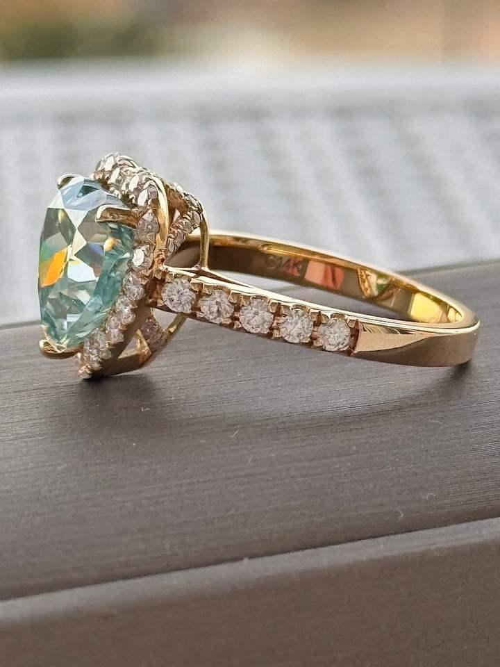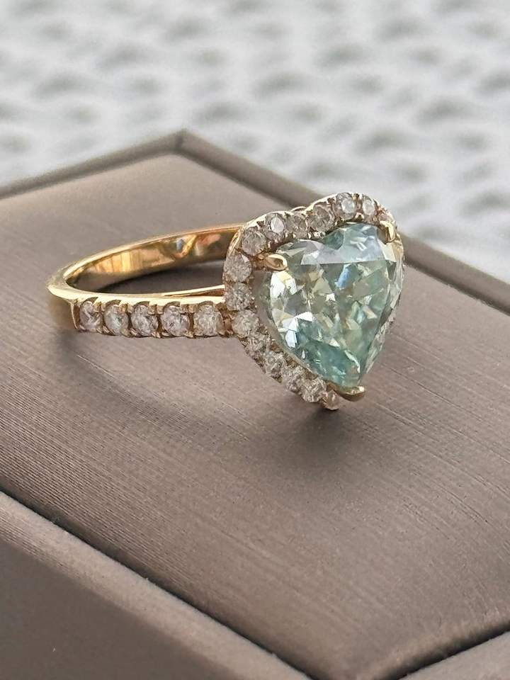 แหวนหมั้นเพชรโมอิสซาไนต์สีฟ้าอ่อนทรงหัวใจประดับเพชรแบบ Crushed Ice ชุบทอง 14K เงินแท้ 925 สำหรับผู้หญิง