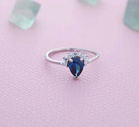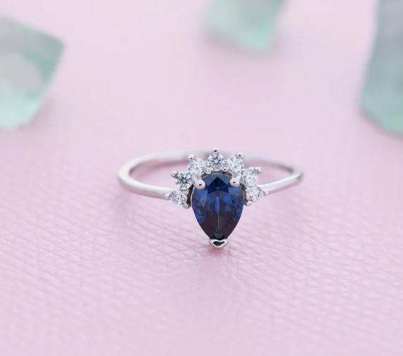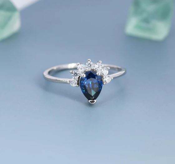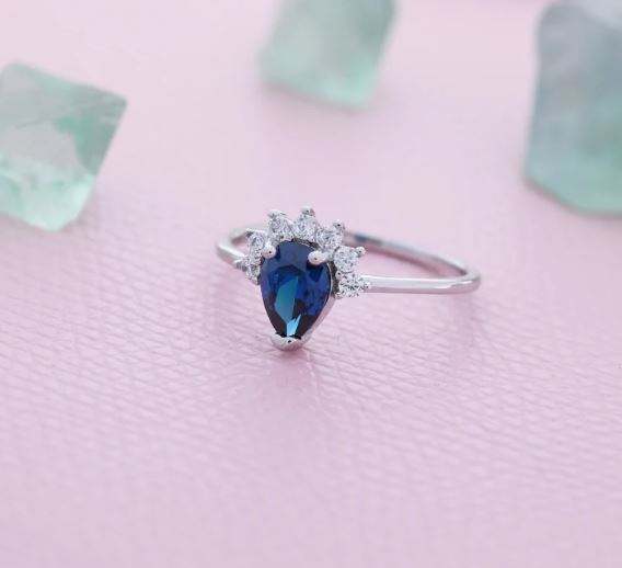 แหวนเงินแท้ 925 ชุบทอง 14k ดีไซน์มงกุฎวินเทจ ประดับพลอยแซฟไฟร์ทรงลูกแพร์และเพชร CZ สำหรับเดือนกันยายน เหมาะสำหรับงานหมั้นและงานแต่งงาน