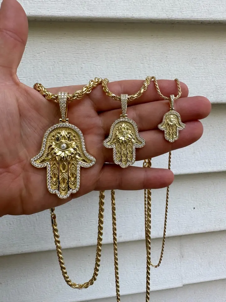 จี้รูปมือฮัมซาพร้อมตาปีศาจ ประดับด้วยโมอิสซาไนต์ 2 กะรัต ทำจากเงินแท้ 925 ชุบทอง สไตล์ฮิปฮอปสำหรับผู้หญิง