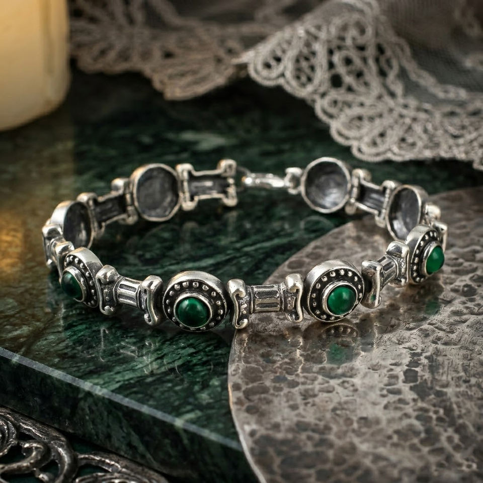สร้อยข้อมือเงินแท้ 925 สไตล์โบราณสำหรับผู้หญิง ประดับด้วยหินอาเกตสีเขียว | เครื่องประดับทำมือจากตุรกีสำหรับเป็นของขวัญหรือใส่ไปงานปาร์ตี้