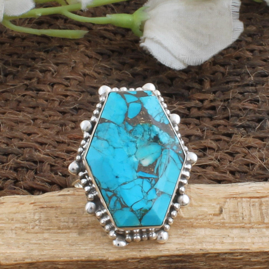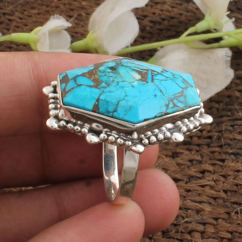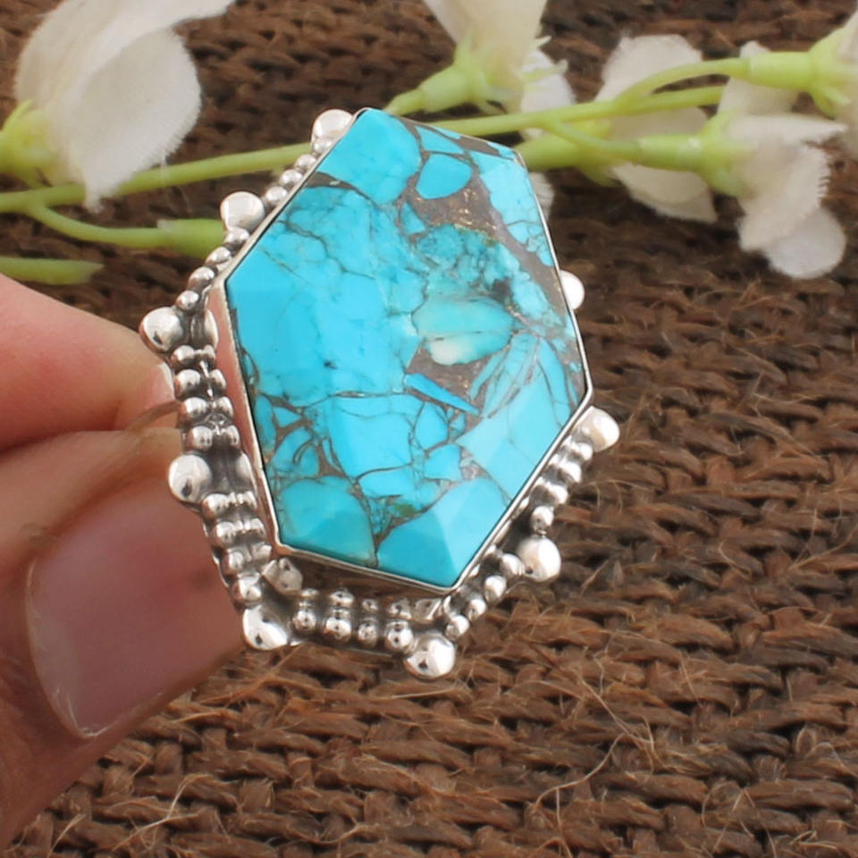 แหวนเงินแท้ 925 ประดับด้วยเทอร์ควอยซ์สีน้ำเงินทรงเหลี่ยมเจียระไนแบบบริลเลียนท์ งานแฮนด์เมด สไตล์โบโฮคลาสสิก เรียบหรู เหมาะสำหรับงานแต่งงานและงานปาร์ตี้