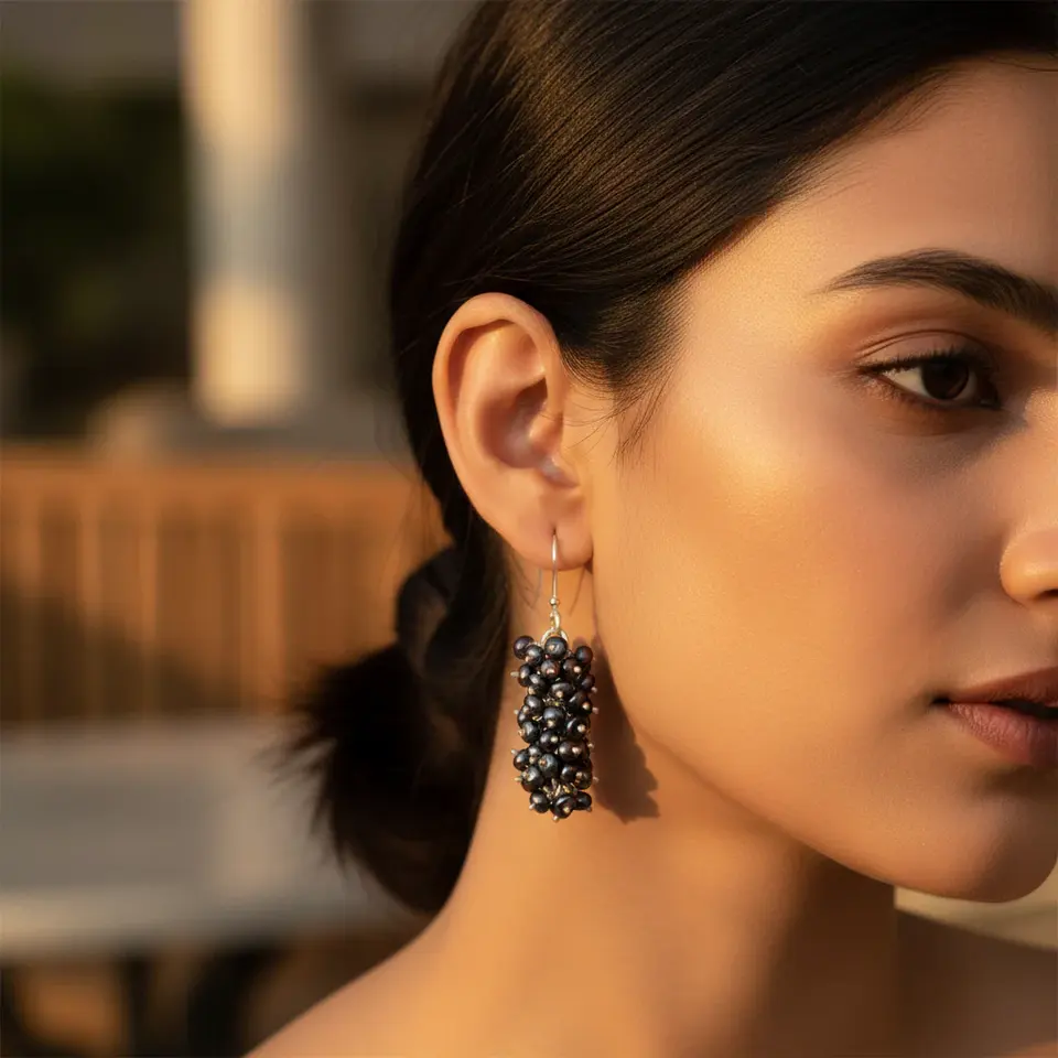 ต่างหูเงินแท้ 925 ประดับมุกดำทรงกลุ่ม