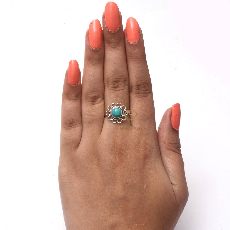 แหวนพลอยออกแบบสไตล์โบฮีเมียนสีเงินสเตอร์ลิงพร้อมขอบเทอร์ควอยซ์สำหรับงานแต่งงานฝังดอกไม้