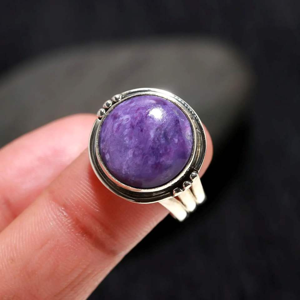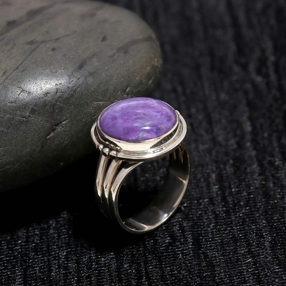 แหวนเงินแท้ 925 ดีไซน์คลาสสิกสำหรับคู่รัก ประดับด้วยพลอยชาโรอิท เหมาะสำหรับงานแต่งงาน งานหมั้น วันครบรอบ หรือเป็นของขวัญ