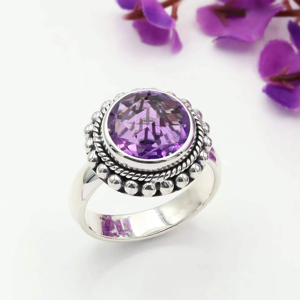 แหวนพลอยอเมทิสต์ทรงกลมสีเงินสเตอร์ลิง925สำหรับงานครบรอบแต่งงานหรือของขวัญสำหรับงานเลี้ยง