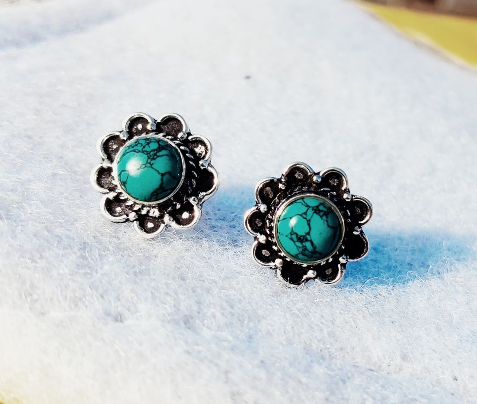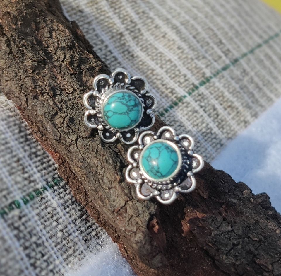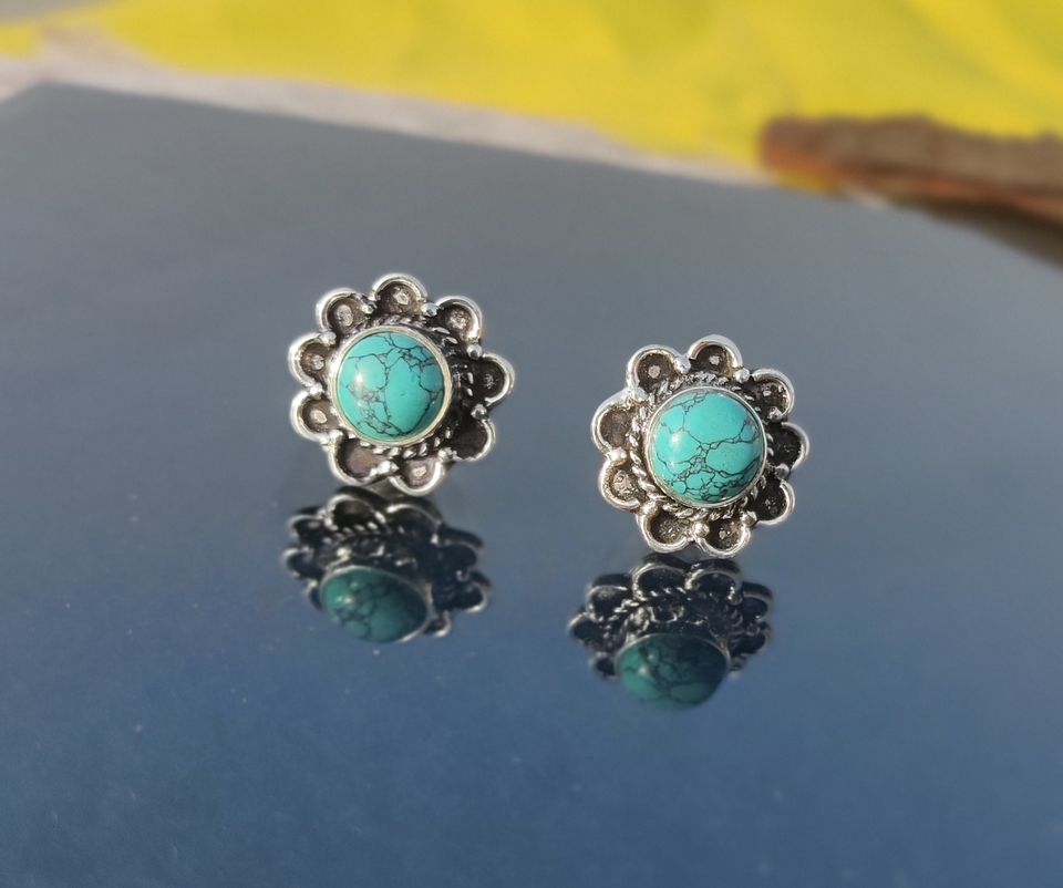 ต่างหูสตั๊ดสีเงินสเตอร์ลิงสี925แบบคลาสสิกพลอยเทอร์ควอยซ์สีทองแดงตัดกลมสำหรับปาร์ตี้วันครบรอบรูปแบบคู่รัก