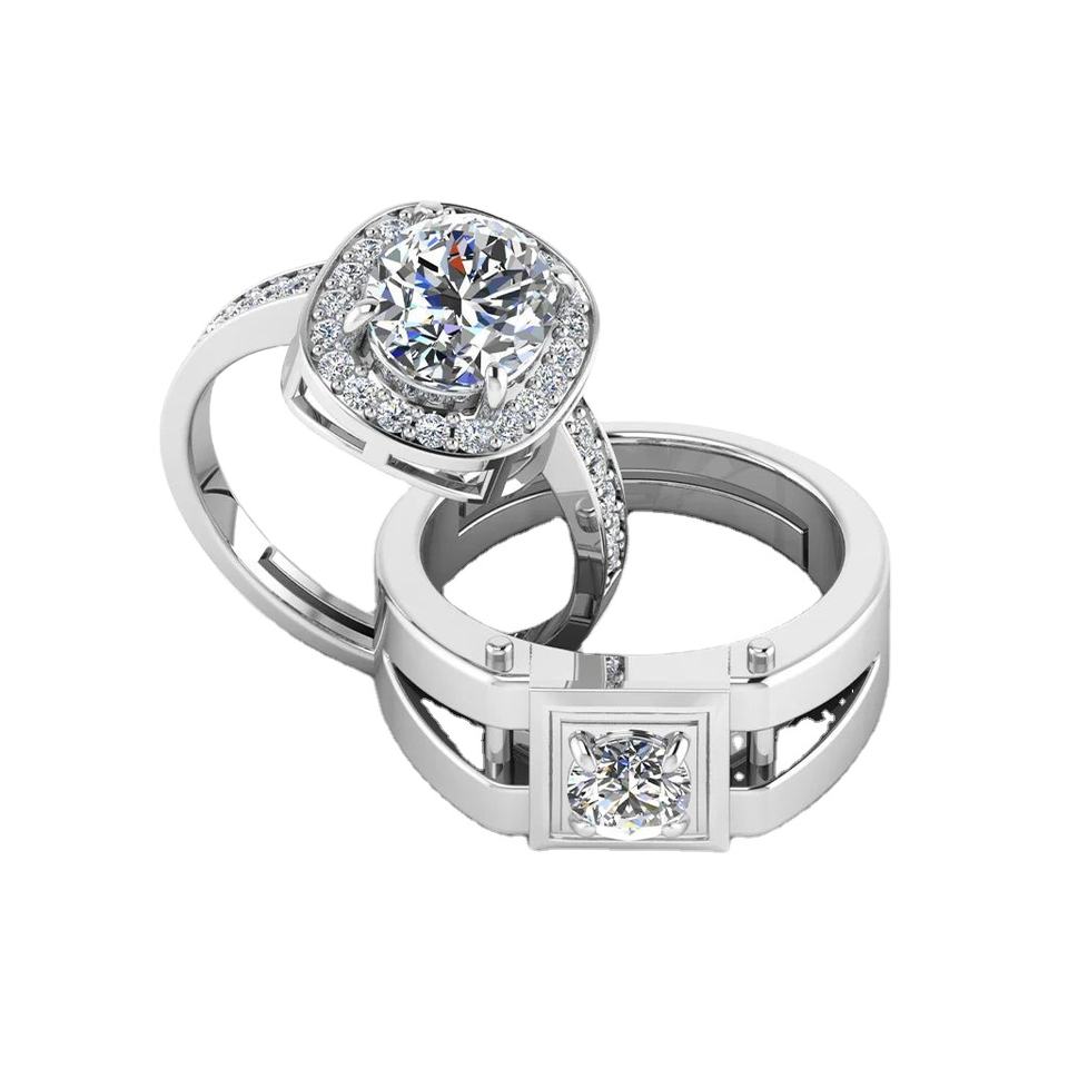 ชุดแหวนคู่สีเงินสเตอร์ลิง925สำหรับเขาและเธอมีหัวใจและเพชร CZ เจียระไนทรงกลมเหมาะสำหรับงานหมั้นหรือวันครบรอบ