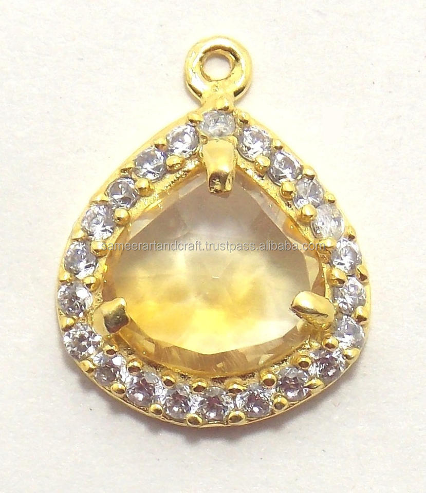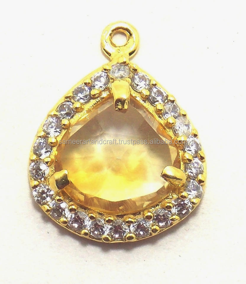 925เงินสเตอร์ลิงลูกบาศก์เซอร์โคเนียทรงลูกแพร์ขั้วต่อฝาทองชุบซิทรินควอตซ์อัญมณี