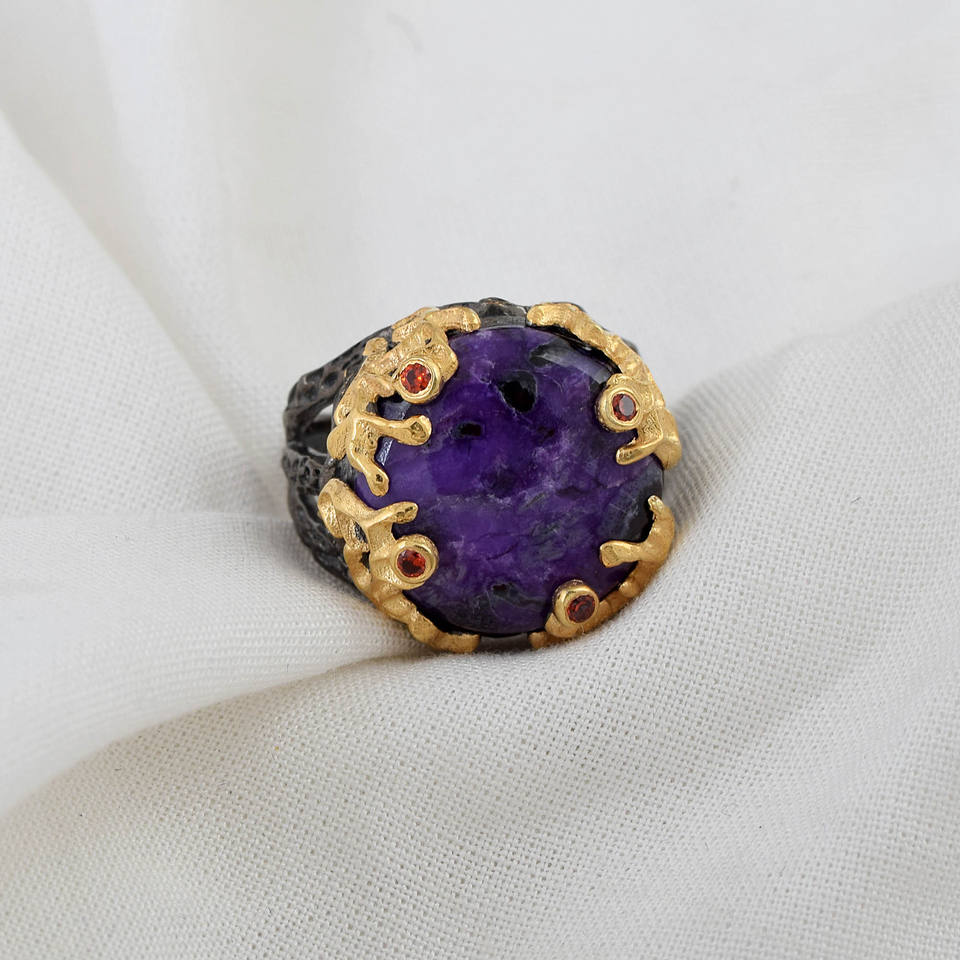 แหวนแต่งงานสุดสวยเงินสเตอร์ลิง925สีดำโรเดียมชุบทองโกเมนสีแดงธรรมชาติเครื่องประดับการตั้งค่าฝาหวานสีม่วง