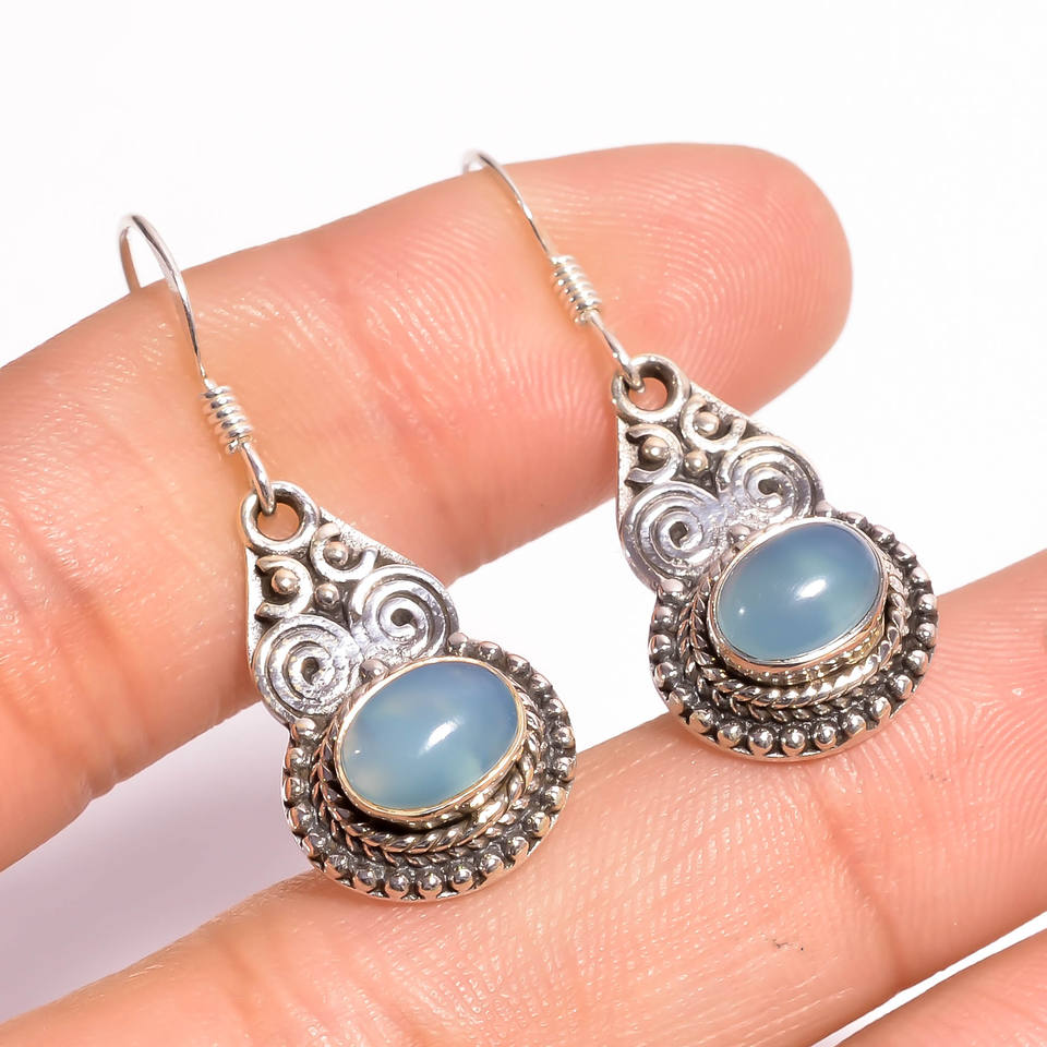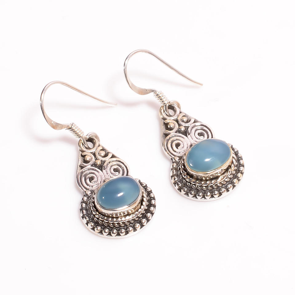 925ต่างหูห้อยเงินสเตอร์ลิงเครื่องประดับสไตล์คลาสสิกที่ดีพร้อมอัญมณีคาลซิโดนีสีฟ้า