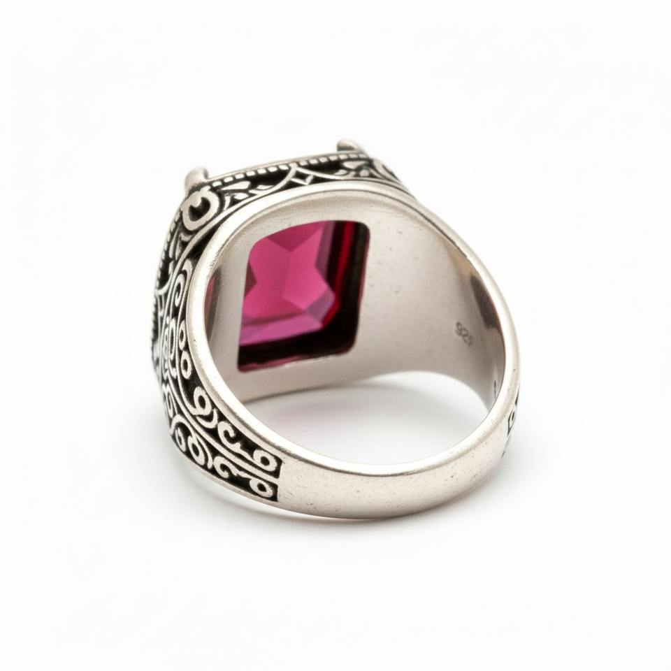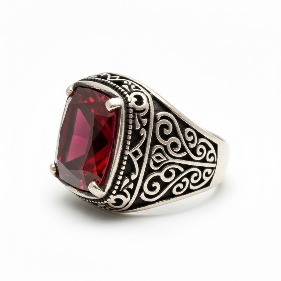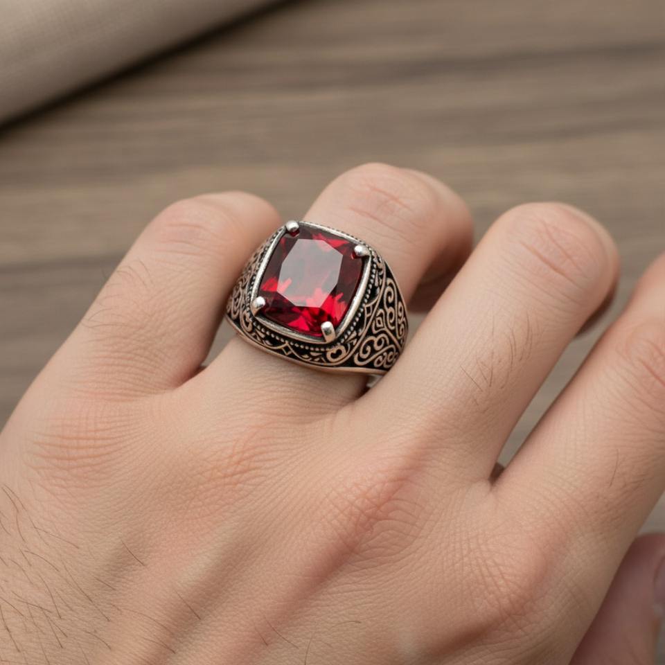 แหวนหมั้นเงินสเตอริง925สีแดงสีเบาะตัดเพทายหินเหลี่ยมเพชรพลอยสำหรับผู้ชายงานแต่งงานสไตล์วินเทจฝาเครื่องประดับตุรกี