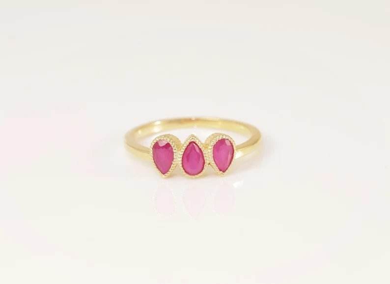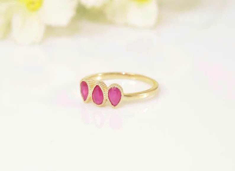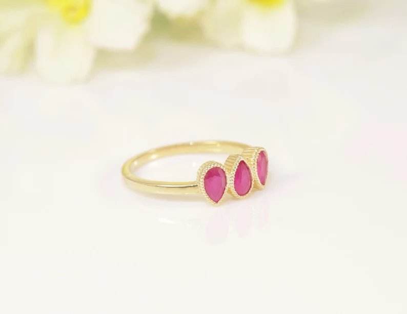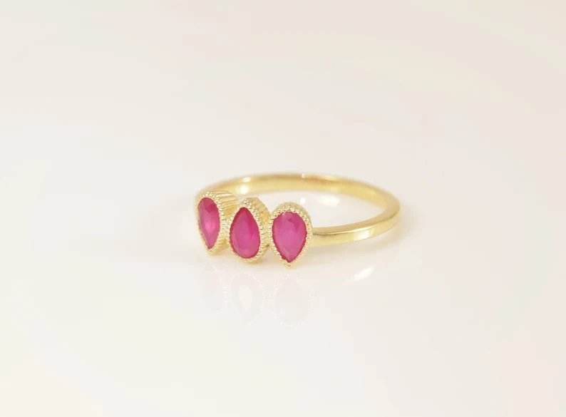 925 Sterling Silver Fine Jewelry 18K Gold Unique Ruby Glass-Filled Pear Cut Three-Stone Ring Wedding Engagement Party Fingers
