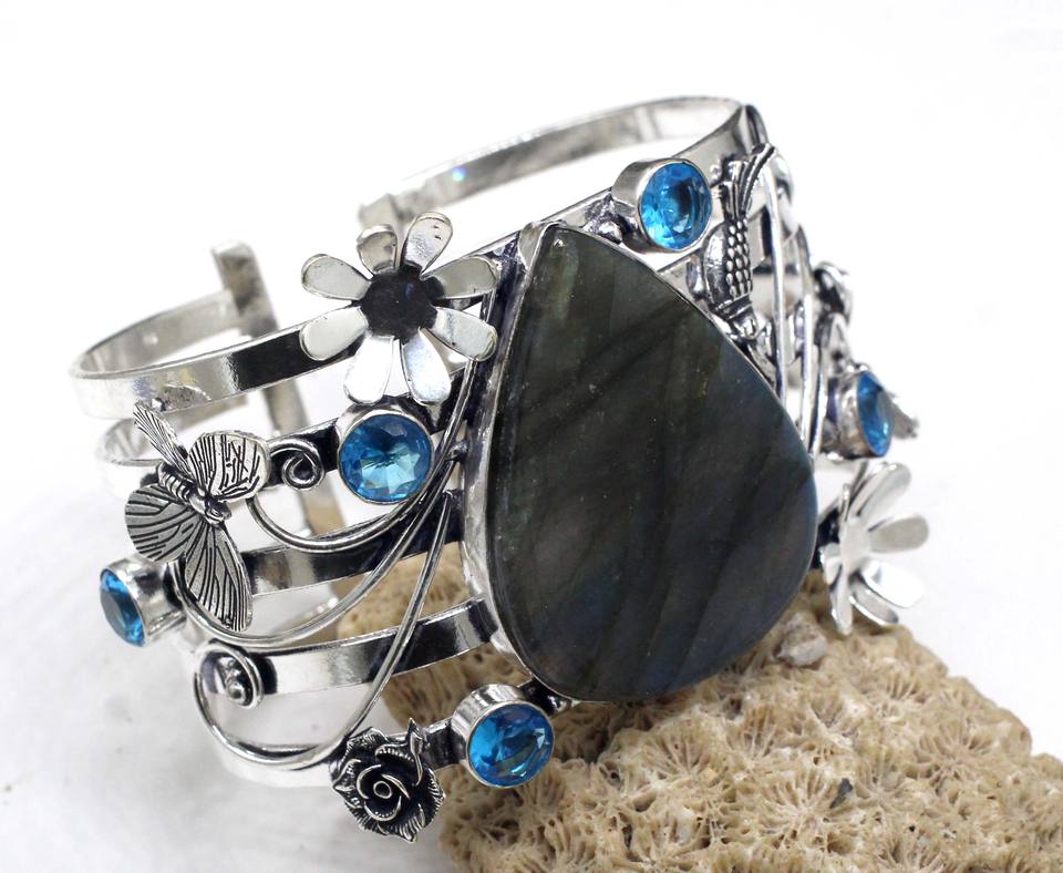 กำไลข้อมือเงิน925รูปดอกไม้หินลาบราดอไรต์ธรรมชาติอัญมณีบุษราคัมสำหรับงานแต่งงานของคริสเตียน