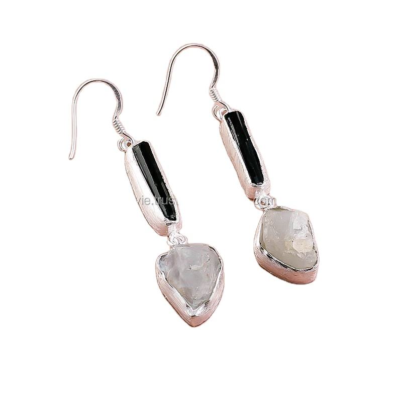 ต่างหูเงินแท้ 925 ประดับพลอยอะความารีนธรรมชาติและพลอยทัวร์มาลีนสีดำแบบดิบ งานโบราณ เหมาะสำหรับงานแต่งงาน