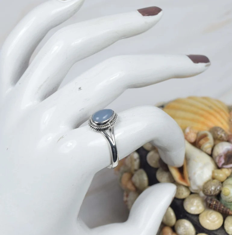 แหวนพลอยเงินสเตอร์ลิง925พลอยคาลซิโดนีสีน้ำเงินเครื่องประดับรูปลูกแพร์ทำด้วยมือสำหรับทุกเพศไอเดียของขวัญวันอีสเตอร์